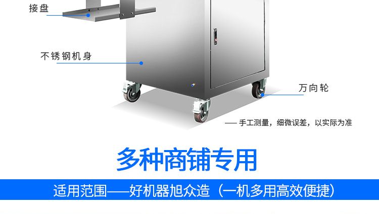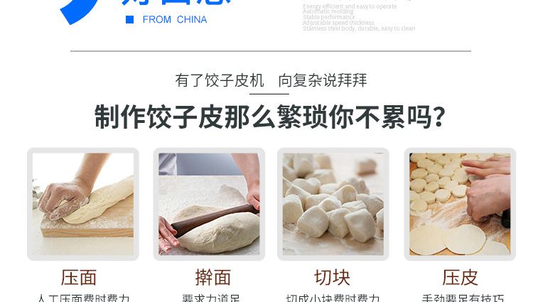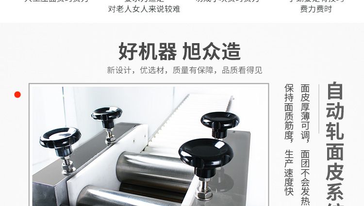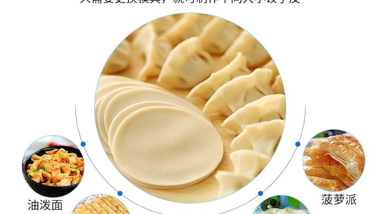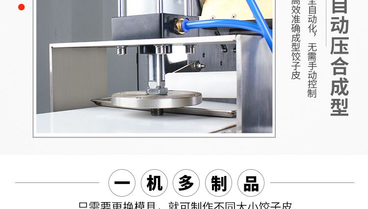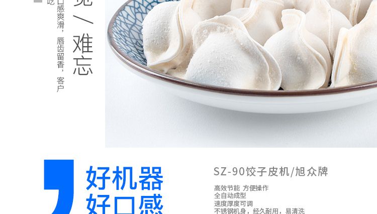 JGB-90型餃子皮機(jī)是我公司開(kāi)發(fā)生產(chǎn)的先進(jìn)餃子皮生產(chǎn)設(shè)備??梢院?jiǎn)單更換模具(可根據(jù)客戶定制不同形狀、尺寸的模具),本設(shè)備采用氣缸運(yùn)動(dòng)。本廠生產(chǎn)的90餃子皮機(jī),采用多道壓面輥壓面,壓面效果優(yōu)異,壓出的面皮筋道,進(jìn)一步提高所包出的餃子口感。