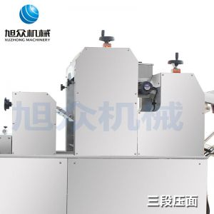 旭眾牌SZ-09C多功能三段酥餅機采用三段漸進式打薄再將面皮壓成合適的厚度。由自動出餡機將餡料充填至面皮上,經卷面輪將面皮卷成圓柱狀,最后以成型刀具切割成球狀。長條狀餅胚,整個成形過程不會破壞面皮筋性,保持手工原味。