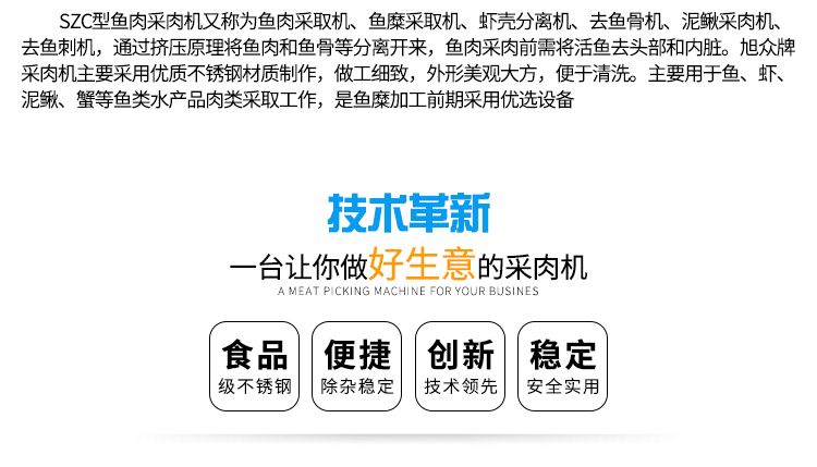 旭眾XZC系類魚肉采肉機(jī)是一款專業(yè)加工魚肉去刺、蟹蝦去殼的機(jī)械,由于隨著市場的發(fā)展,人們生活中漸漸離不開有魚的生活,無論是家里、飯店等魚都是主要的食物還有現(xiàn)在一些休閑食品中都是離不開魚加工后的魚泥。魚肉采肉機(jī)的研制成功給人們生活中帶來很多方便,無論是您做魚丸、魚餡等只需要一款魚肉采肉機(jī)就可以實(shí)現(xiàn),對于大量生產(chǎn)即降低了人工成本,又提高了生產(chǎn)效率。